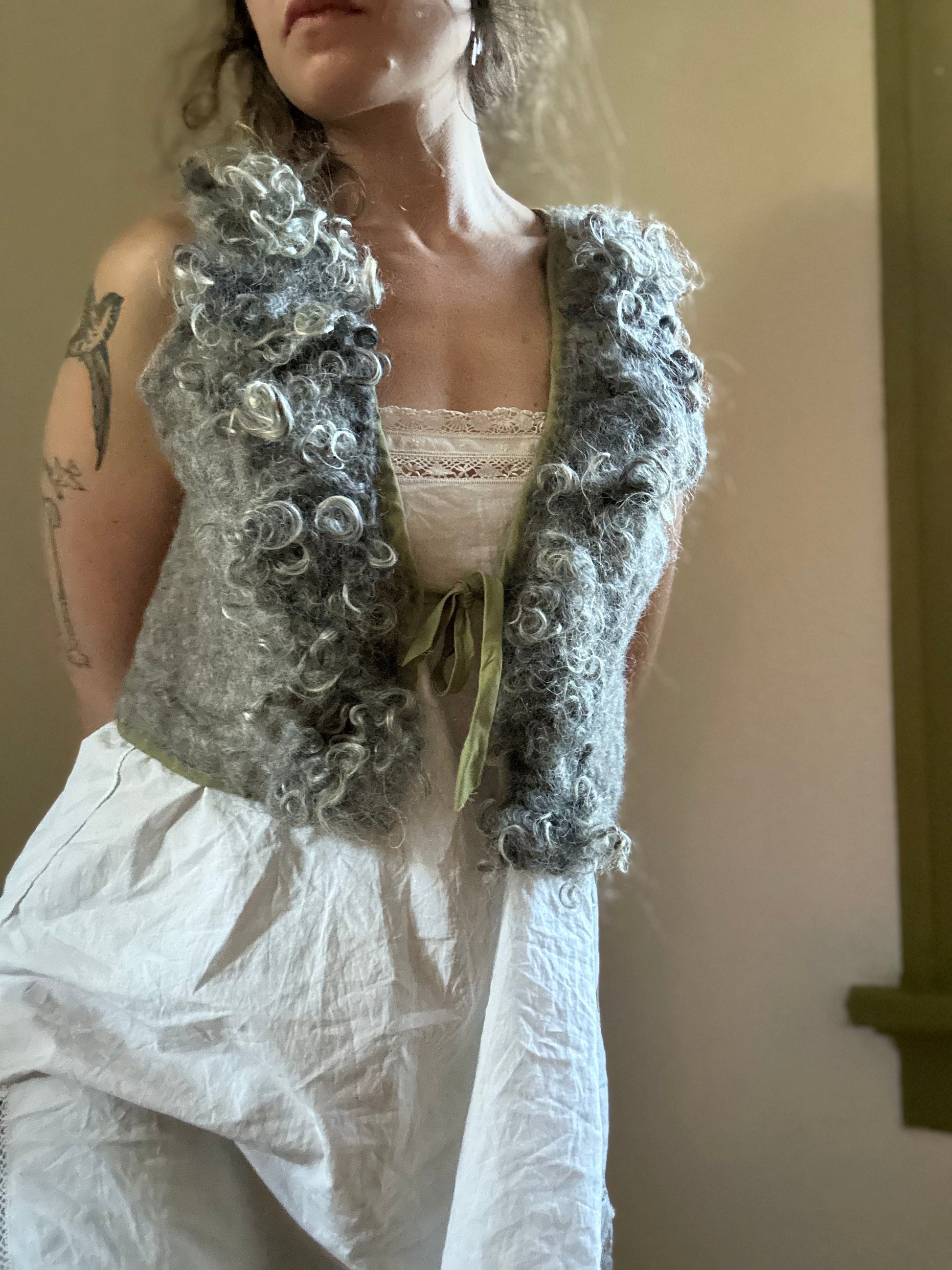 Hand felted wool vest with gotland curls. Created to be worn over a thermal top or light sweater.