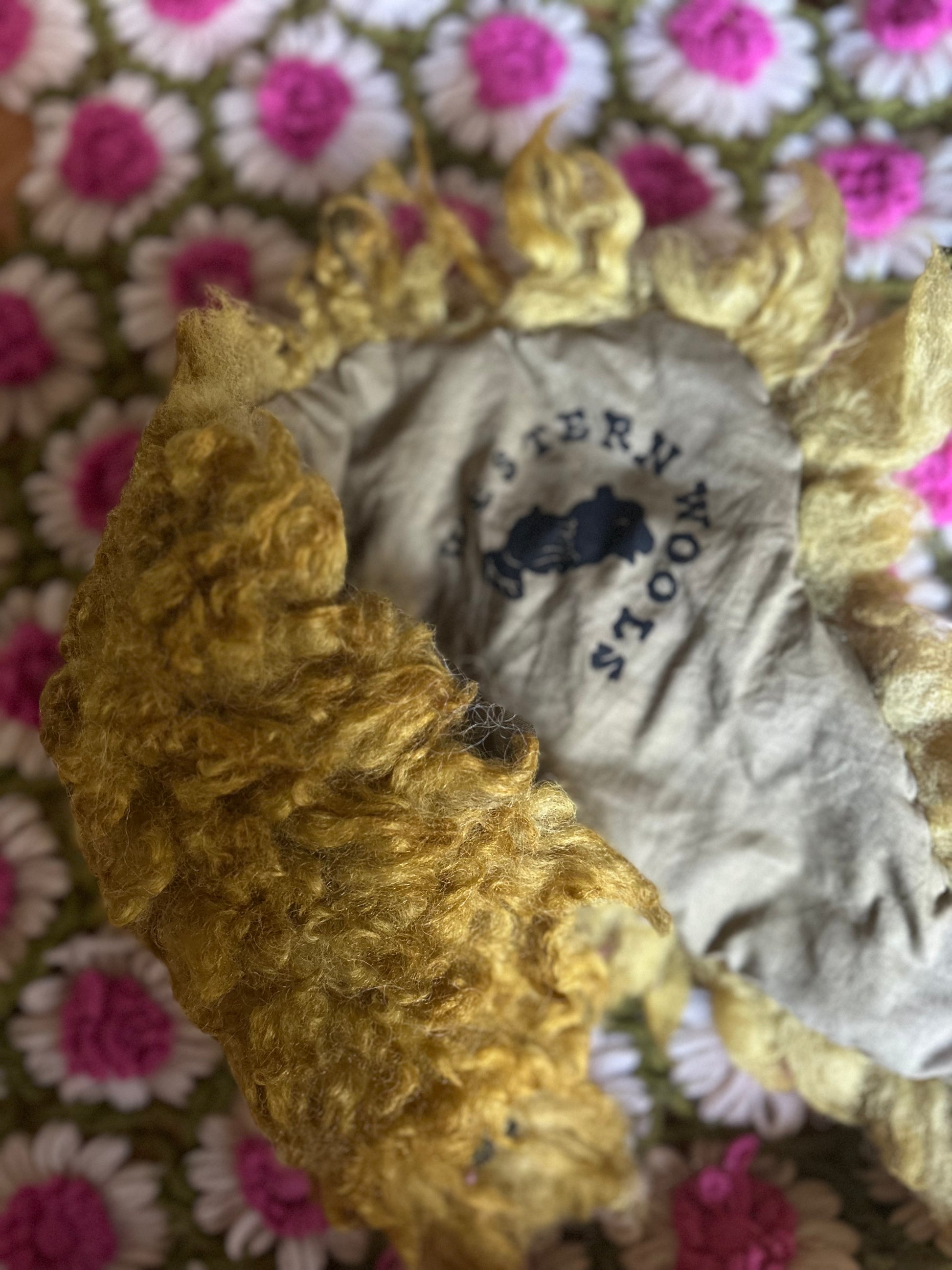 Hand-felted wool snood scarf, hand dyed with locally sourced marigolds, lined with marigold+iron dyed cotton. stamped with hand carved logo.