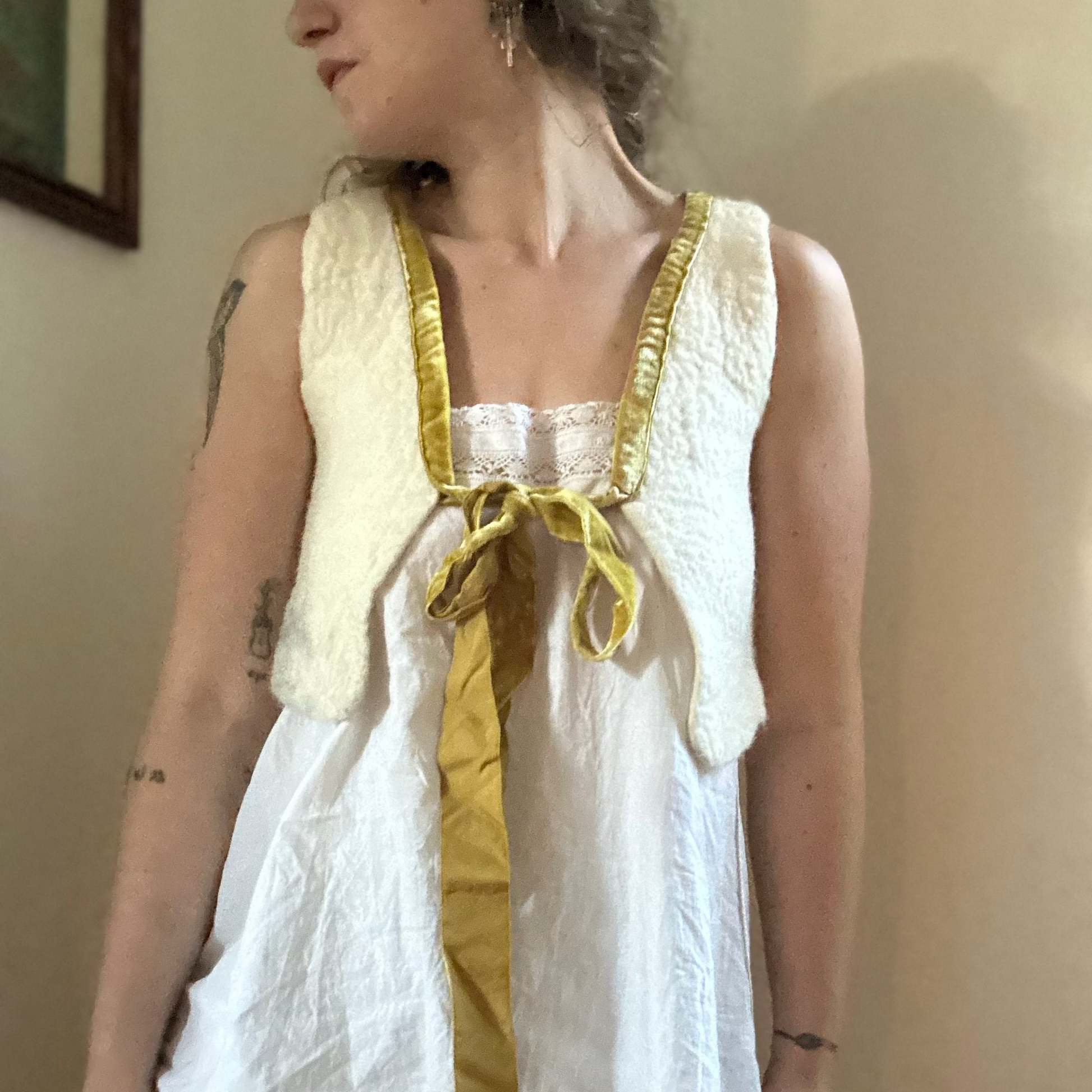 Hand felted wool vest with vintage silk velvet ribbon tie.